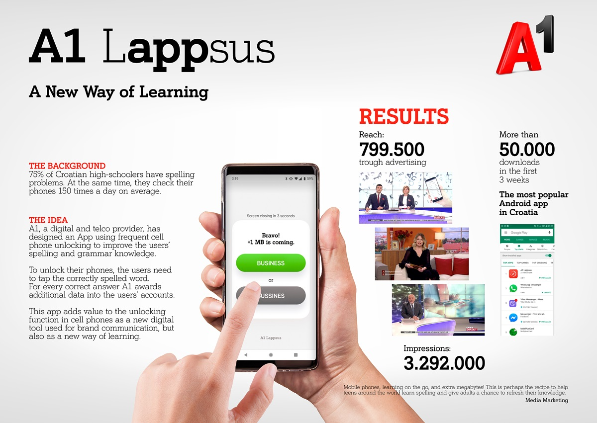 75% of high schoolers have trouble with spelling. Yet they’re glued to their phones, checking them 150 times a day on average. This caused them to often be short of data, which was something their parents had little sympathy for. A1, a telco and digital services provider together with Grey its agency partner spotted this insight as an opportunity to engage with families in a fun and relevant way. They created an app that helps kids improve their spelling every time they open their phones. The catch: the teenagers unlock their phones by tapping a correctly spelled word. For every correct answer, A1 adds 1MB of free data to the users’ accounts. The campaign was a success with over 50.000 downloads in the first three weeks, making A1 Lappsus the most popular app in Croatia on Google Play at the time of release.