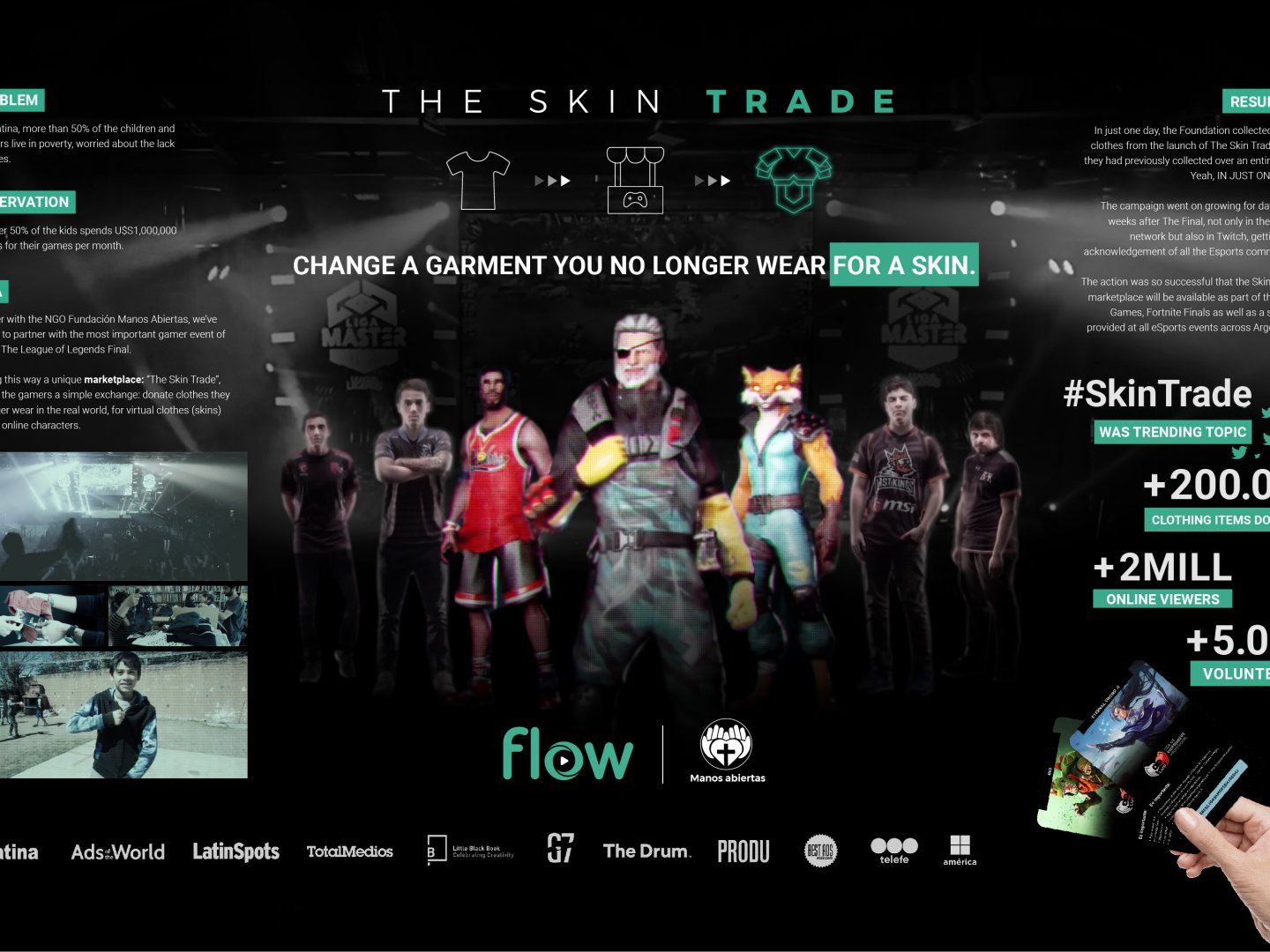 Correlate <brand purpose behaviour in physical world> with <brand benefit in digital world>. While many Argentinian children live in poverty and suffer from a lack of clothing in real life, other kids and teenagers are worried about clothing (skins) in video games. Flow, the main sponsor of eSports in Argentina used this insight to connect the virtual world with the real world to help solve this problem. With the support of Wunderman Thompson, they collaborated with the most important gamer event in LATAM – the ‘League of Legends Final’ – to offer a simple deal for players: Bring clothes they no longer use in exchange for exclusive skins for their videogame heroes.