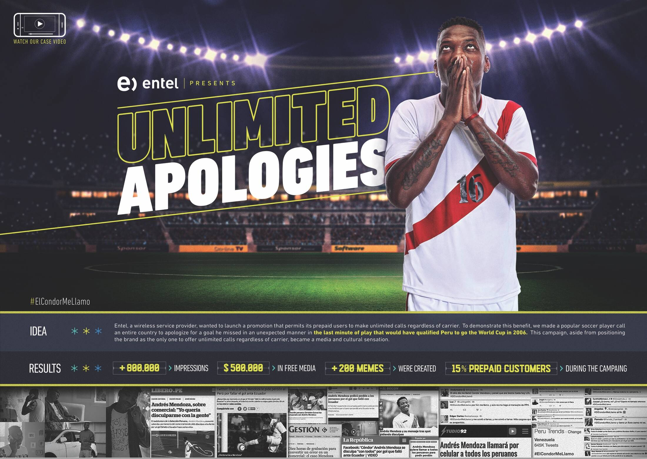 Entel, a wireless provider, wanted to launch a promotion that permits its prepaid users to make unlimited calls regardless of carrier. To demonstrate this benefit, McCann made a popular soccer player call an entire country to apologize for a goal he missed in an unexpected manner in the last minute of play that would have qualified Peru for the World Cup 2006. This campaign, aside from positioning the brand as the only one to offer unlimited calls regardless of carrier, became a media and cultural sensation.