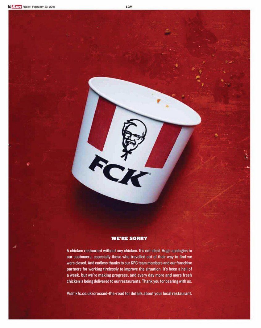 When KFC restaurants in the United Kingdom experienced a significant shortage of chicken, it was forced to close more than half of its 900 British locations closing. This led to customers venting their frustration on social media and even attempting to involve the police. In response, KFC adopted a cheeky creative approach and rearranged its name to spell “FCK” in a full-page print ad in The Sun and Metro. The ad, created by agency of record Mother London, apologized for the inconvenience and acknowledged that a chicken restaurant without chicken is not ideal. This apology took social media by storm in a positive way and the campaign not only demonstrated KFC's commitment to transparency and customer satisfaction, it racked up a ton of awards too.