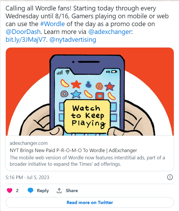 Wordle, the popular daily word puzzle game, has become a global phenomenon with over two billion plays in 2022. Now, The New York Times has integrated ads into Wordle, with DoorDash as one of the launch sponsors. On the mobile web version, users will encounter video and display ads after clicking "Play" and before the game loads. DoorDash has cleverly utilized Wordle as a discount coupon platform, offering a 75% discount using Wordle's word of the day as a promo code every Wednesday. Alongside this, DoorDash has launched an ad campaign from July 3 to August 16, featuring skippable videos that promote their subscription service and other deals. The partnership aims to introduce DoorDash's subscription service to a new audience, facilitated by Wavemaker, DoorDash's media agency.